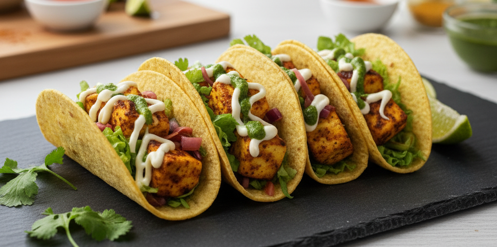 Paneer Tikka Taco recipe सामग्री: पनीर मेरिनेट करने के लिए: 200 ग्राम पनीर (छोटे टुकड़ों में काटा हुआ) 1/2 कप दही 1 टेबलस्पून बेसन 1 टीस्पून अदरक-लहसुन पेस्ट 1 टीस्पून लाल मिर्च पाउडर 1/2 टीस्पून हल्दी पाउडर 1 टीस्पून धनिया पाउडर 1 टीस्पून गरम मसाला पाउडर 1 टीस्पून नींबू का रस (बीज