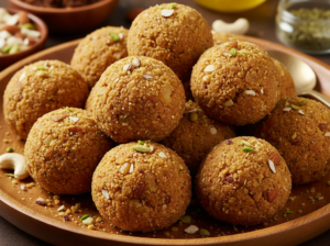 धीमी आंच पर गेहूं का आटा डालकर लगातार चलाते हुए सुनहरा और खुशबूदार होने तक भूनें। फिर भुने आटे में बादाम, काजू, पिस्ता, मखाना और गोंद डालकर 2–3 मिनट चलाएं और गैस बंद कर दें। थोड़ा ठंडा होने पर गुड़ डालें और अच्छे से मिलाएं ताकि गुड़ पिघल जाए। इलायची पाउडर मिलाएं।