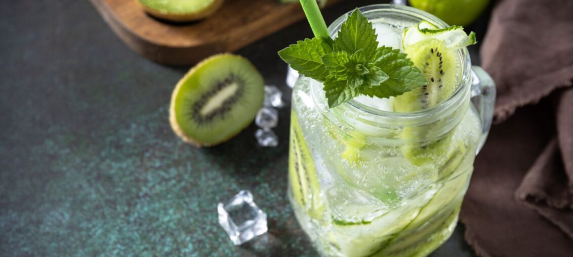 सामग्री: 1 कीवी (छोटे टुकड़ों में कटा हुआ और हल्का मसला हुआ) 8–10 पुदीना के पत्ते (हल्के हाथों से मसले हुए) 1 टीस्पून नींबू का रस (बीज रहित) 1 टीस्पून चीनी 1 गिलास सोडा विधि: सबसे पहले एक गिलास में कीवी और पुदीना डालें । फिर इसमें चीनी और नींबू का रस डालें व साथ ही बर्फ